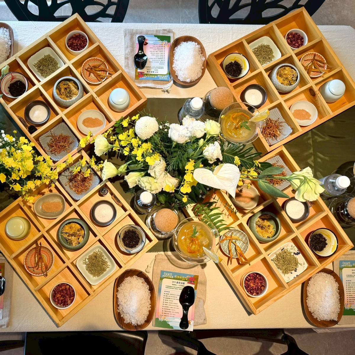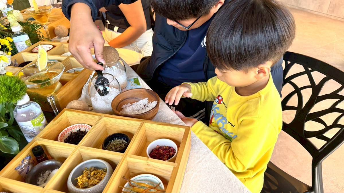 活動首站是人氣爆棚的「DIY 晶泉浴鹽」,以天然礦物鹽搭配花蓮在地柑橘皮與香草植材,攪拌瞬間香氣四溢,把瑞穗溫泉的療癒感完整封存。從花蓮市區前來的羅先生一家在課堂上笑聲不斷,直呼「好玩又療癒」,完成後大家更是手捧作品開心合照,將這份暖心記憶深深收藏。