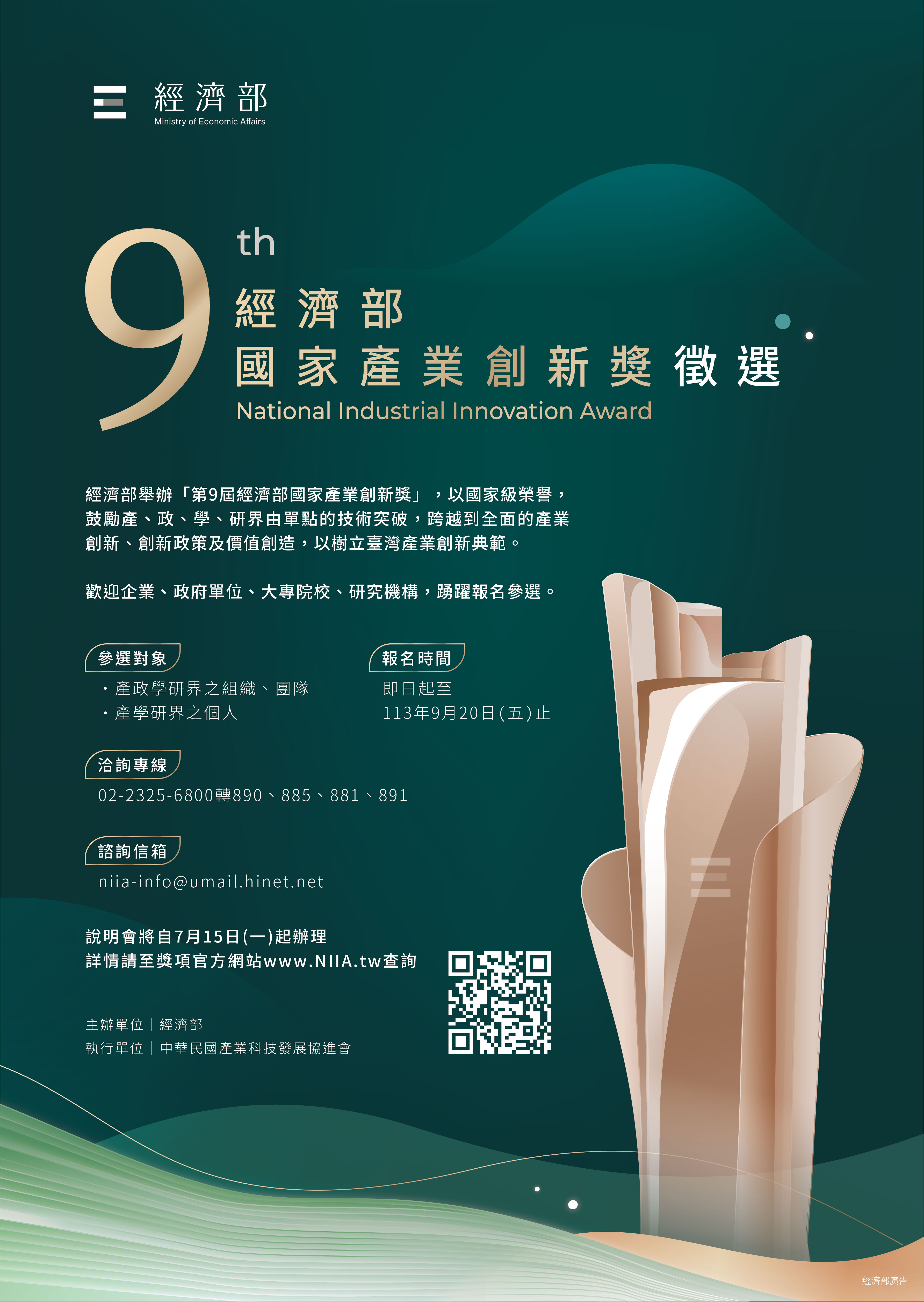 經濟部第9屆「經濟部國家產業創新獎」自即日起至本年9月20日下午5點止受理報名