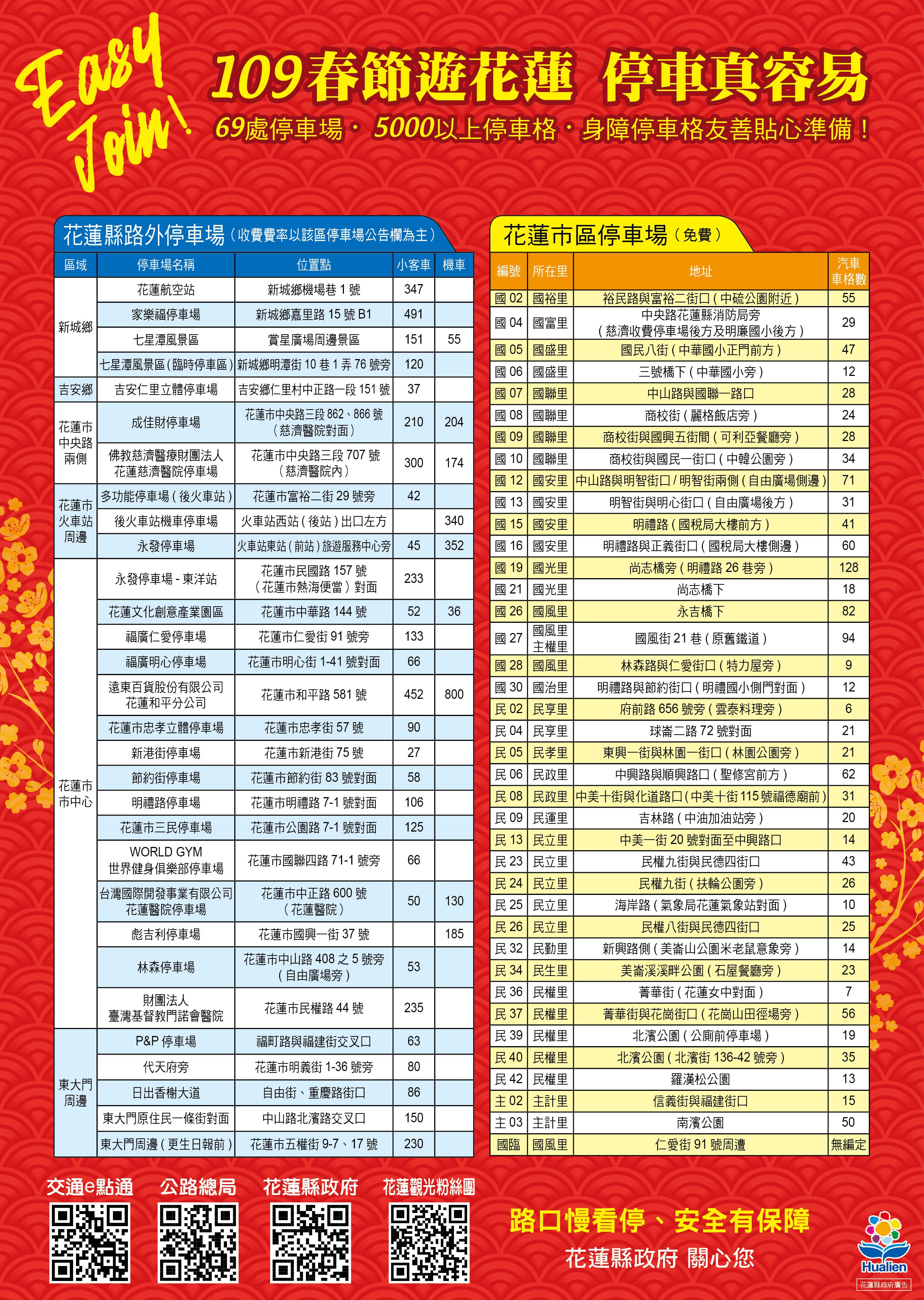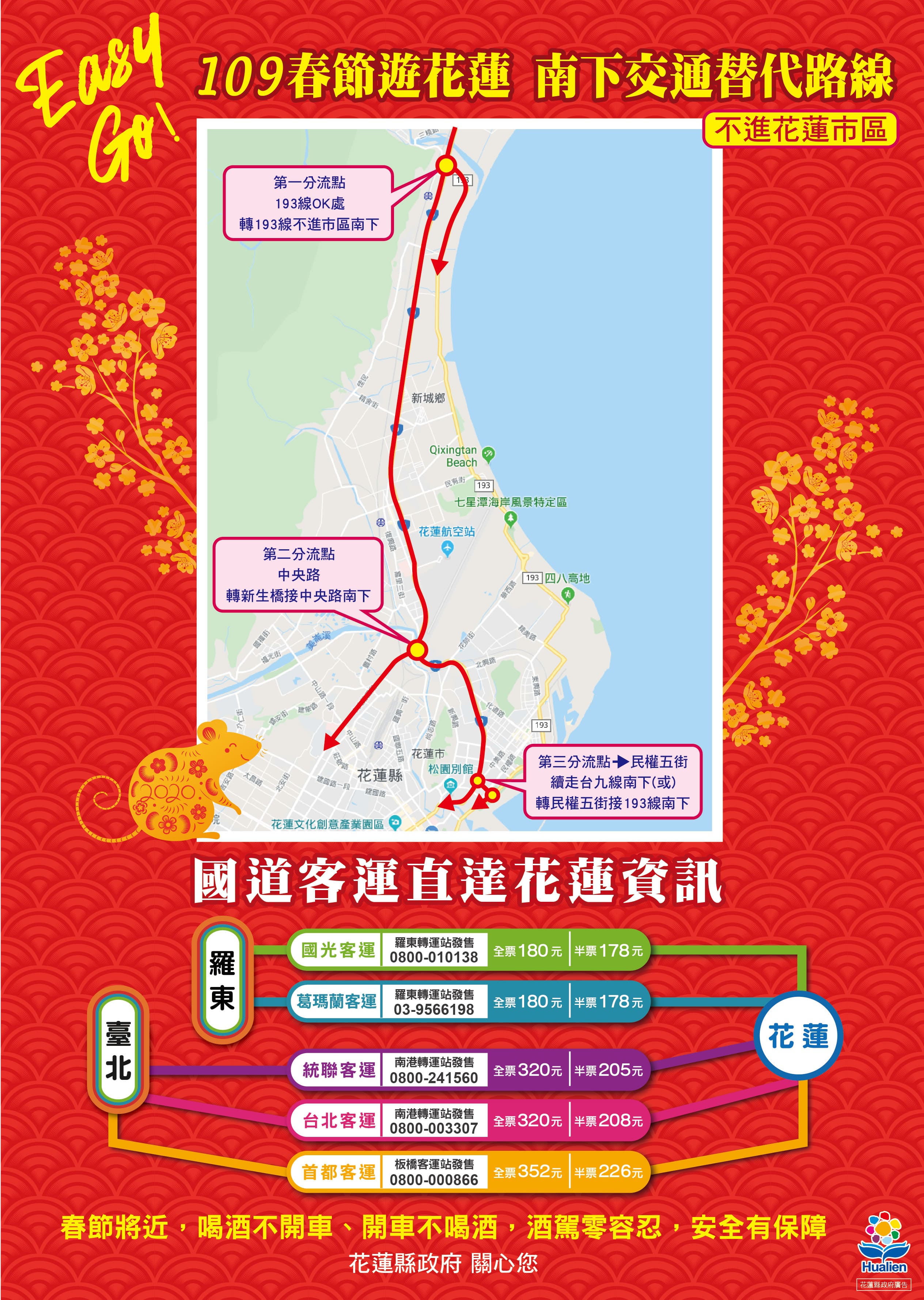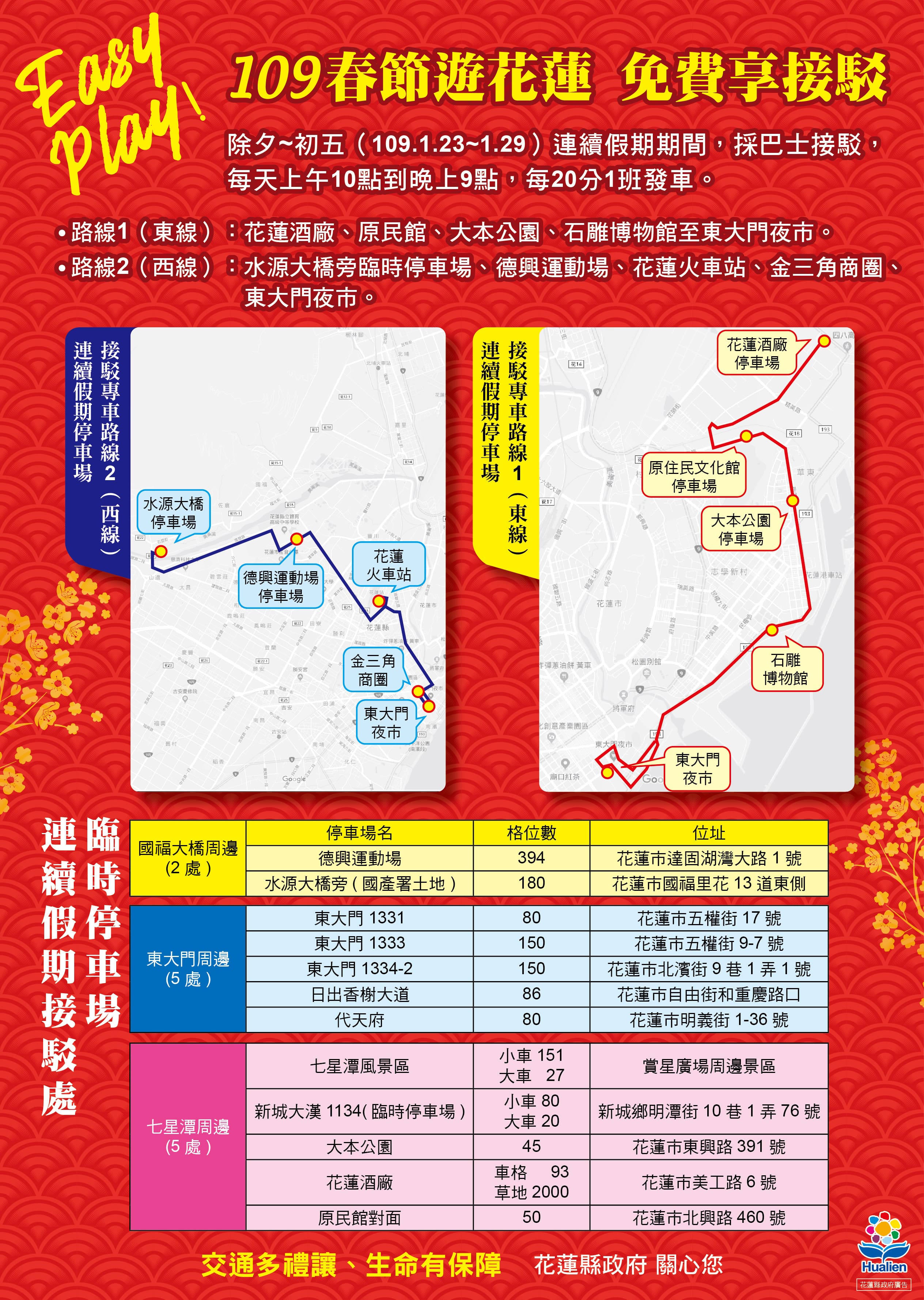 因應春節連續假期的返鄉人潮及喜愛花蓮的遊客到來,花蓮縣政府特別規劃3個分流點的南下替代道路、2條免費接駁搭乘服務及5000格以上的停車格以疏運交通,並製作電子DM放置花蓮縣府的官網、花蓮交通e點通、觀光資訊網,春節期間透過警廣及省道交通資訊電子看板同步露出即時交通資訊,提供來花蓮的旅客更順暢的行車路線、更多元的用路選擇及更便利的停車服務。