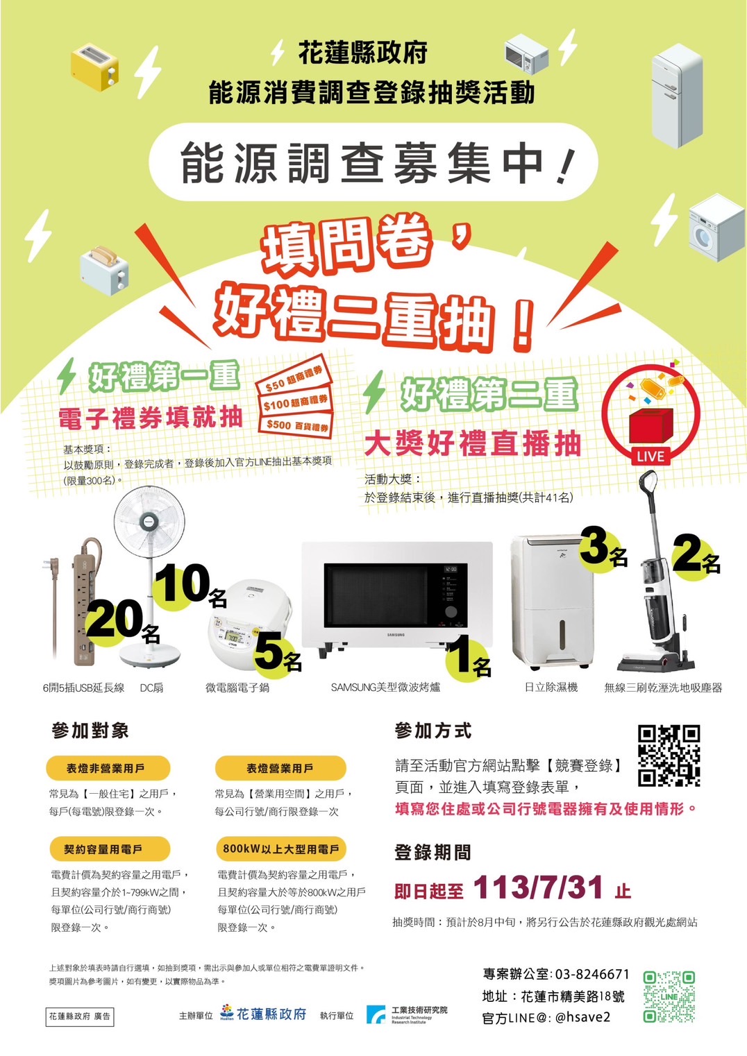 為強化節能意識、提升民眾對能源議題的關注度,並提供本縣後續節能推動策略的參考依據,花蓮縣政府首次推出「能源消費調查登錄暨抽獎活動」,自即日起至113年7月31日止,只要上網到活動登錄平台填寫問卷,就可享好禮二重抽,除了有近350份的電子禮券及獎品等著大家,更有機會獲得節能除濕機、智能微波烤爐、智能乾溼洗地吸塵器等大獎。歡迎民眾、商家、公司行號等自主登錄用電情形,一起踴躍響應本活動!