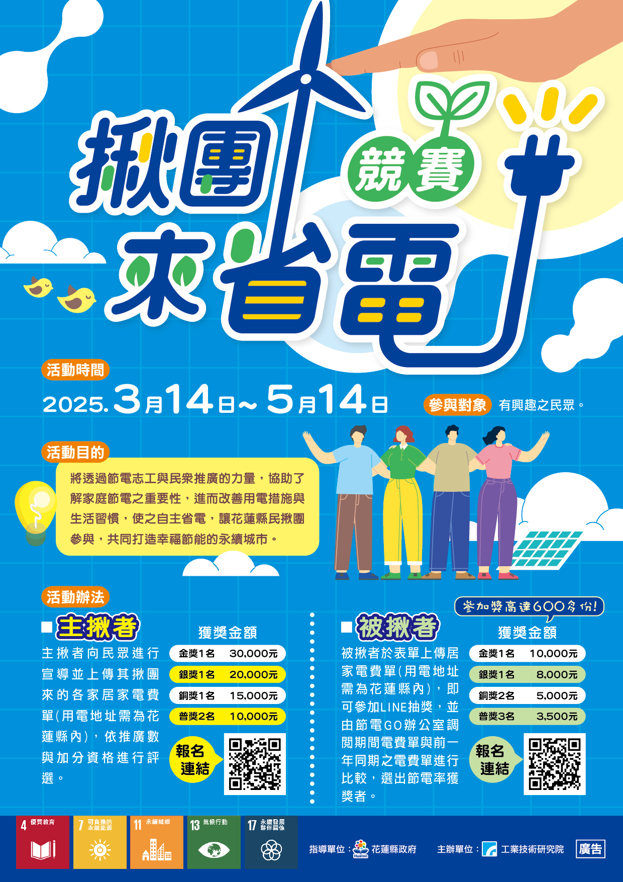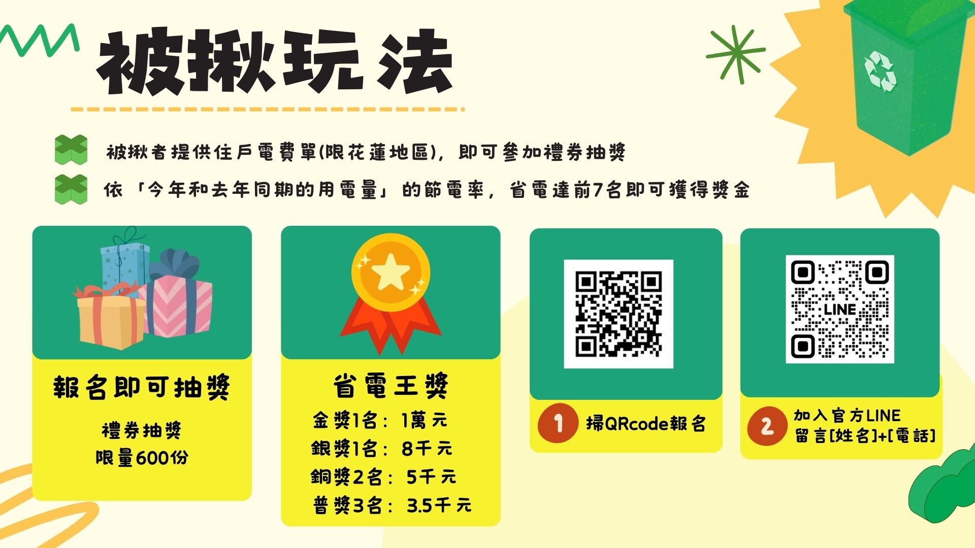 被揪報名:上傳居家電費單(用電地址需為花蓮縣內),符合資格者就可抽超過600份的商品電子禮券,並由節電GO辦公室調閱期間電費單與前一年同期之電費單進行比較,節電率較高者可獲得