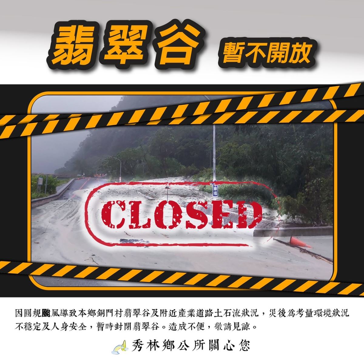 因圓規颱風致秀林鄉銅門村翡翠谷及附近產業道路發生土石流情形,為考量災後環境狀況仍不穩定及人身安全下,暫時不開放。造成不便,敬請見諒。
