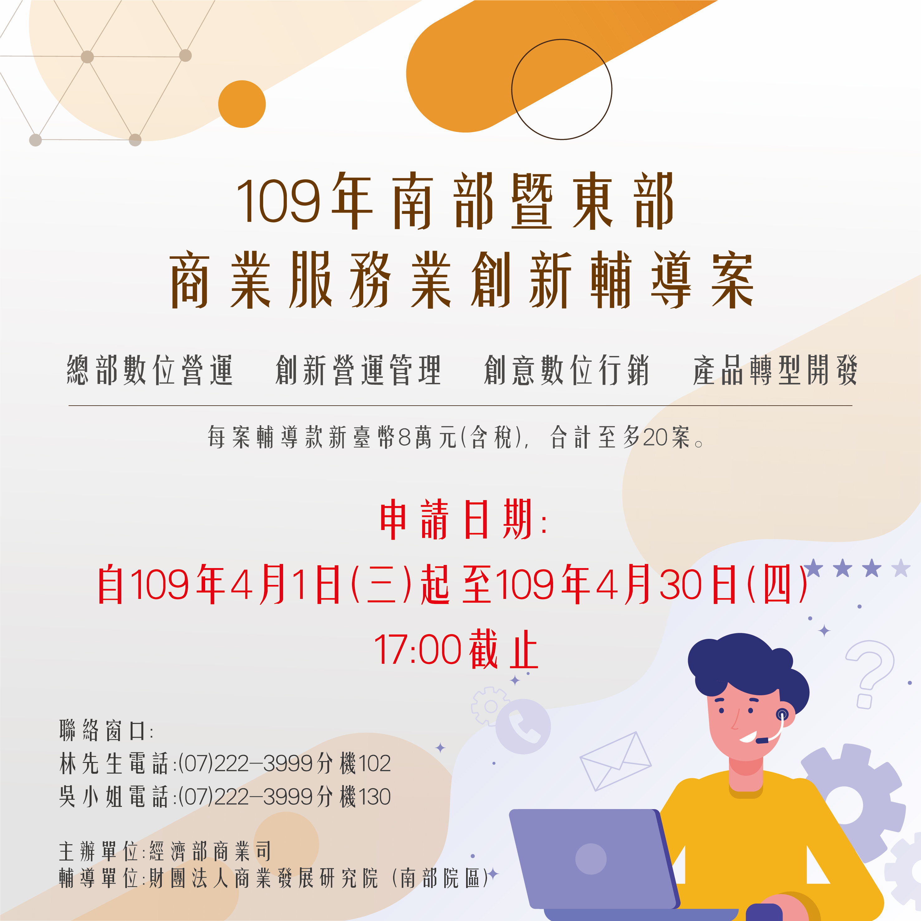 經濟部商業司109年度「南部暨東部地區商業服務業創新發展輔導」已開始受理申請,歡迎本縣中小企業踴躍提案