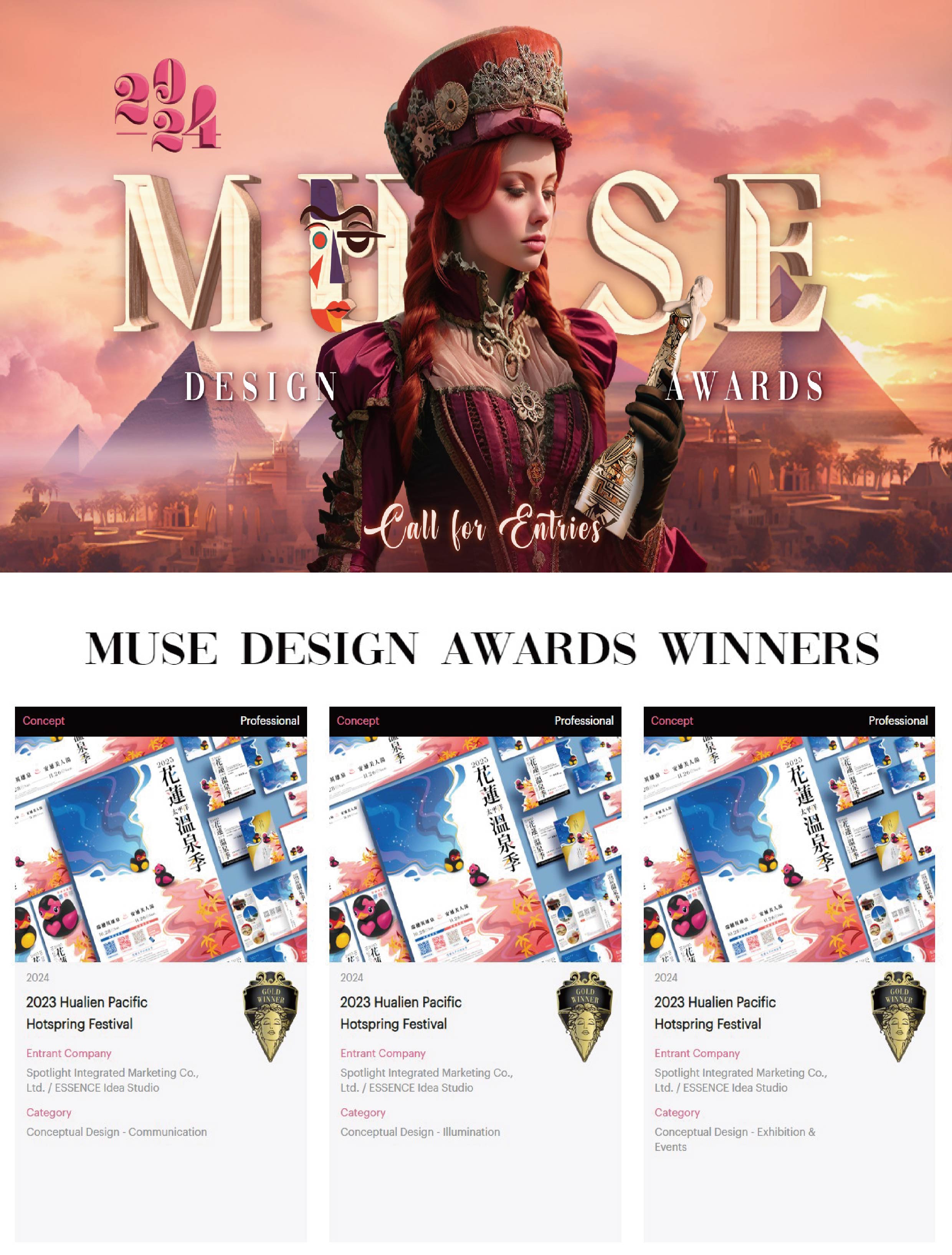 繆思設計獎(Muse Design Awards)是全球創意設計領域最具影響力的國際獎項之一。在3月15日公布的2024繆思創意大獎(Muse Creative Awards)得獎者中,「2023花蓮太平洋溫泉季」一舉勇奪「概念設計(Conceptual Design)」組別的「視覺傳達設計」、「展演活動」及「燈光裝置」三項金獎 (Gold Award)肯定,讓本次溫泉季的英雄湯、美人泉的唯美主視覺設計,以及瑞穗、安通溫泉區結合在地柚子、金針花與絕美星空所佈設的浪漫燈飾躍上世界舞台,未來也將吸引更多國內外遊客來到花蓮享受英雄泉、美人湯雙湯魅力,並進一步認識花蓮在地多元文化與傳統,留下難以忘懷的美好回憶。
