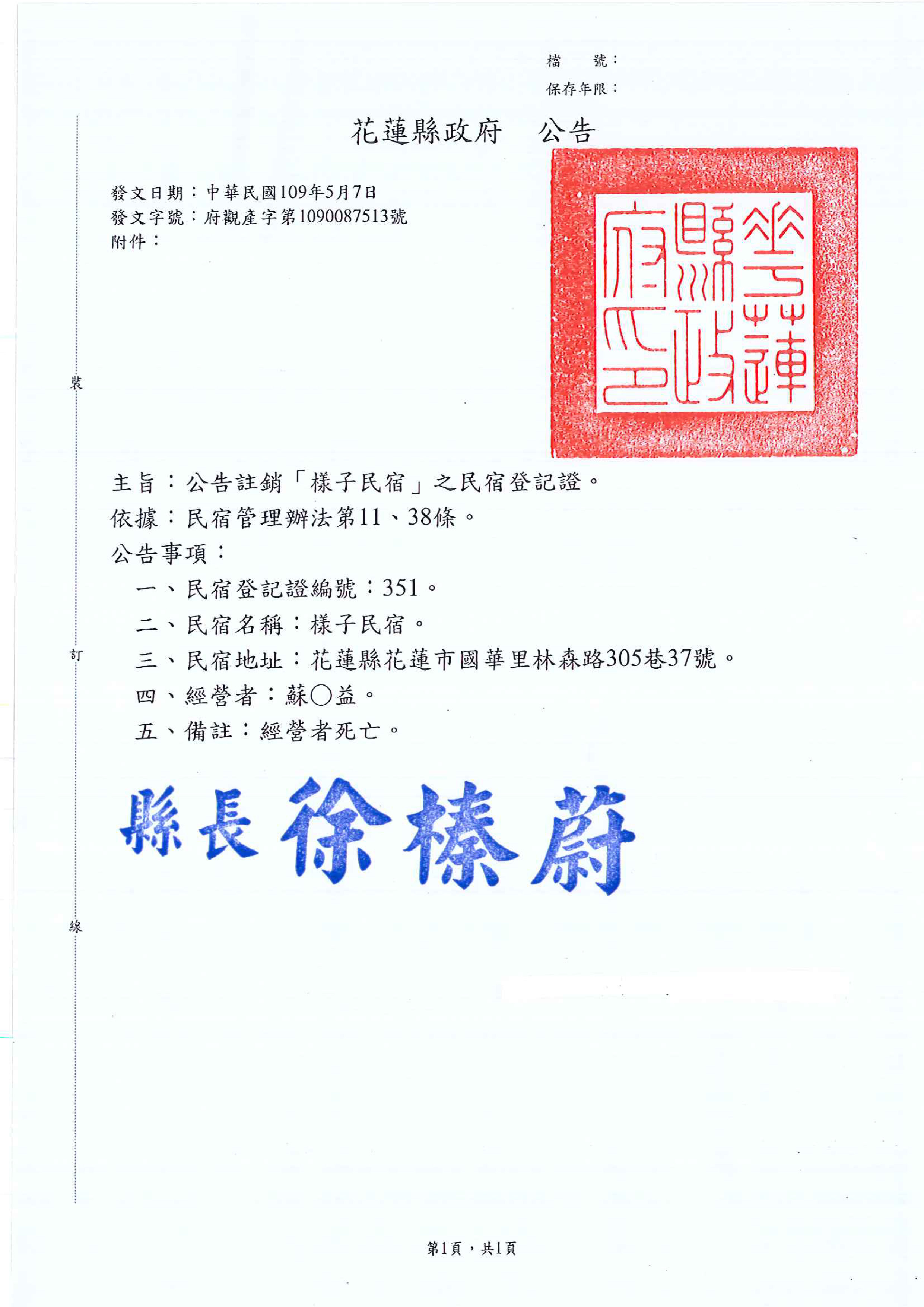 主 旨:公告註銷「樣子民宿」之民宿登記證