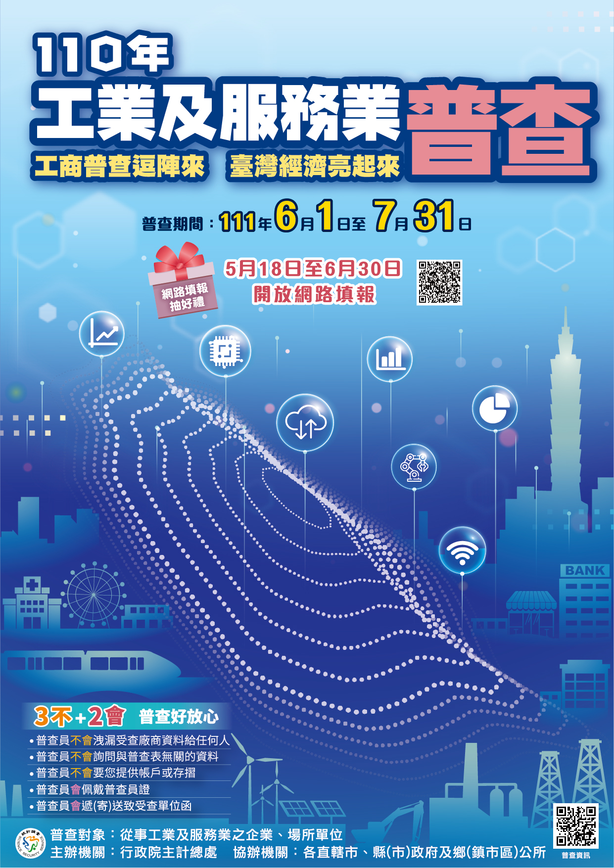 政府為配合國家建設、釐定經貿政策、推動工商業發展 、加強區域規劃,以及提供企業 投資與經營管理所需資訊 於今( 111年 6月1日至7月31日期間,舉辦110年工業及服務業普查。