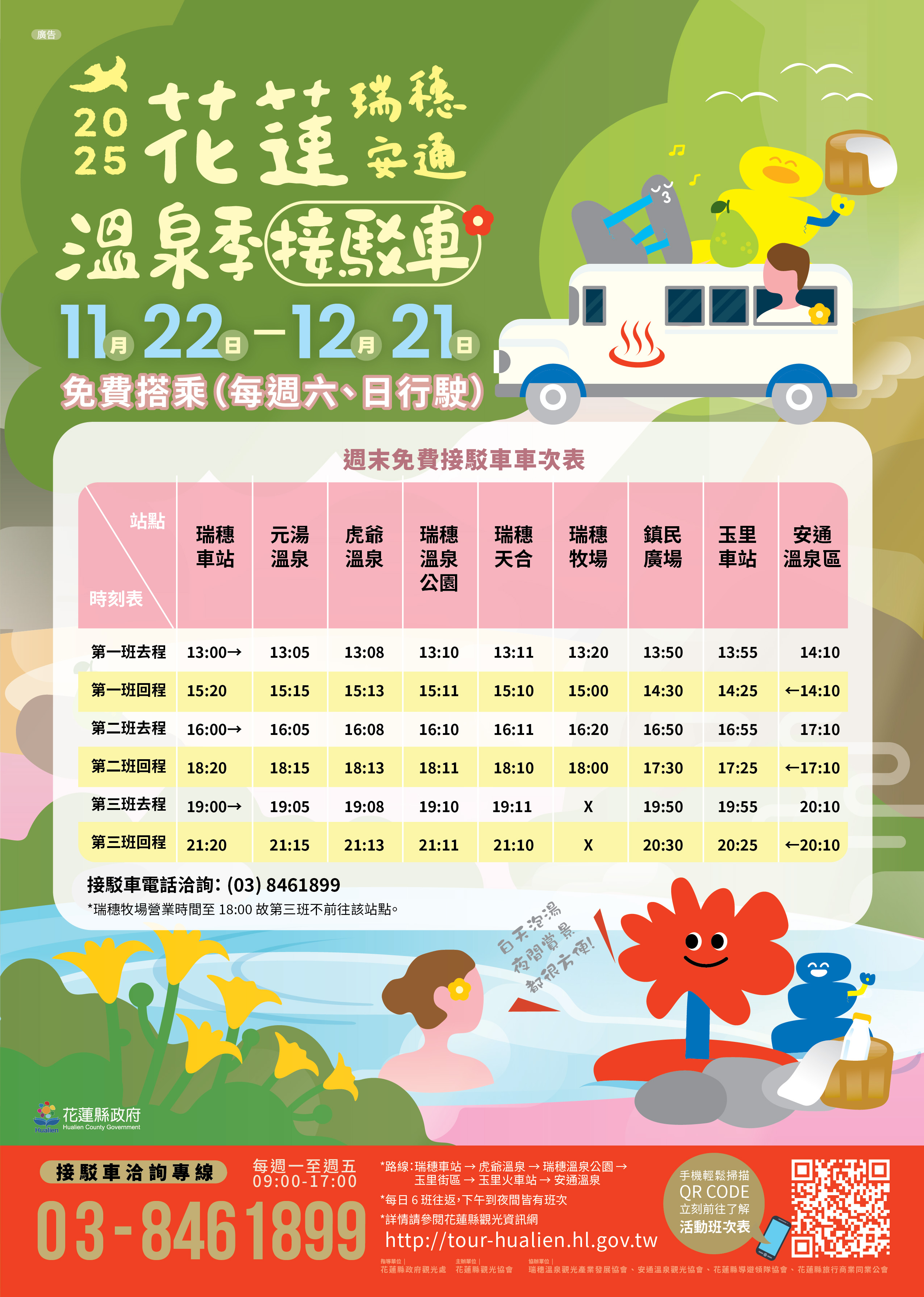 https://hotspring.hl.gov.tw;「花蓮溫泉專車」與「週末免費接駁車」資訊請見花蓮觀光資訊網(ttps://reurl.cc/6b06A5),或電洽接駁車(03)8461899/溫泉專車(03)8533231