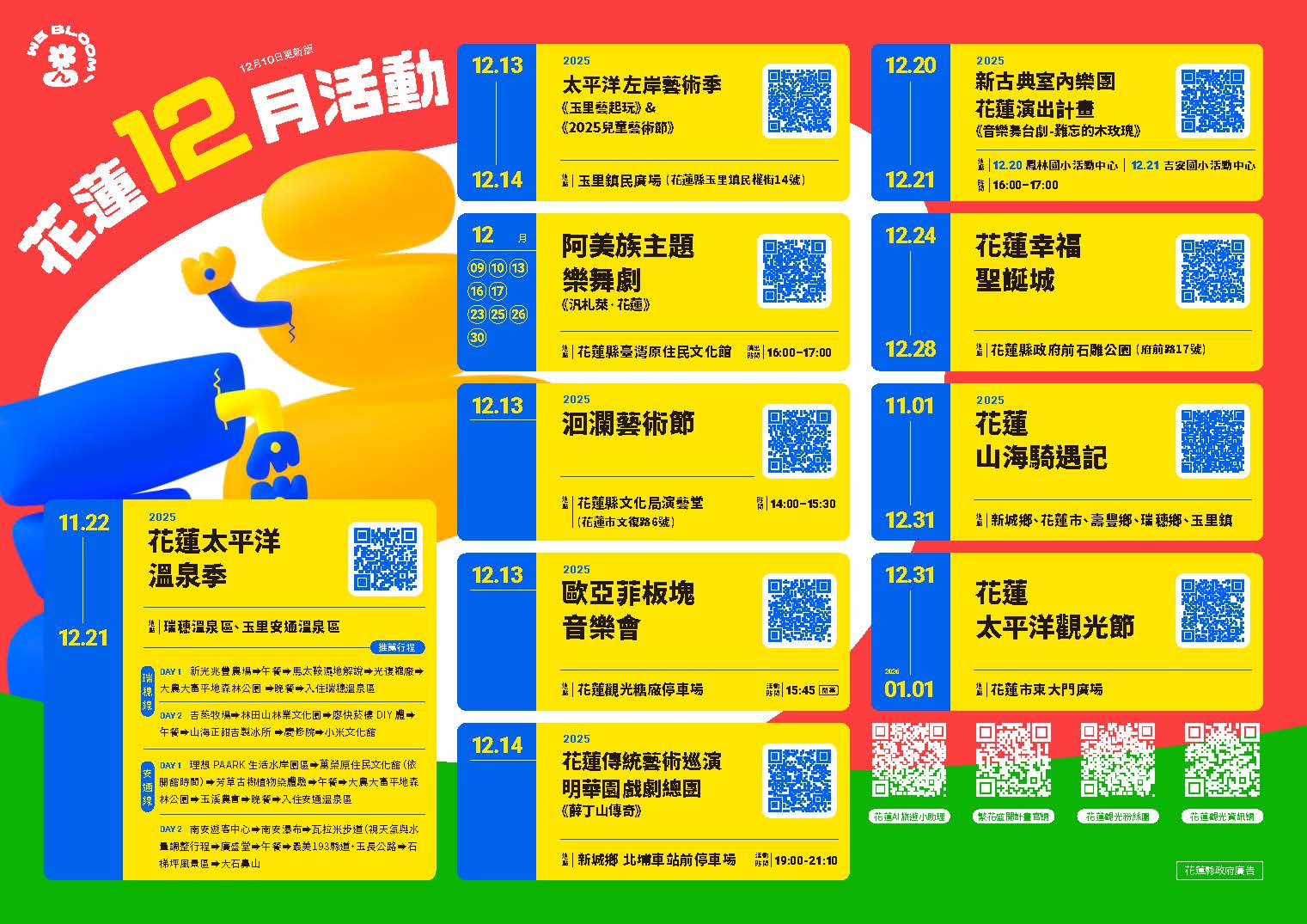 迎接冬季旅遊熱潮,花蓮縣政府邀請旅客在冬季走進花蓮,不只是欣賞風景,更是在旅途中與城市相互陪伴,從太魯閣壯麗景色到城市夜色舞台,從部落文化到節慶燈光,十二月的花蓮以多層次、多亮點的活動內容,帶來最具代表性的年度旅程體驗。