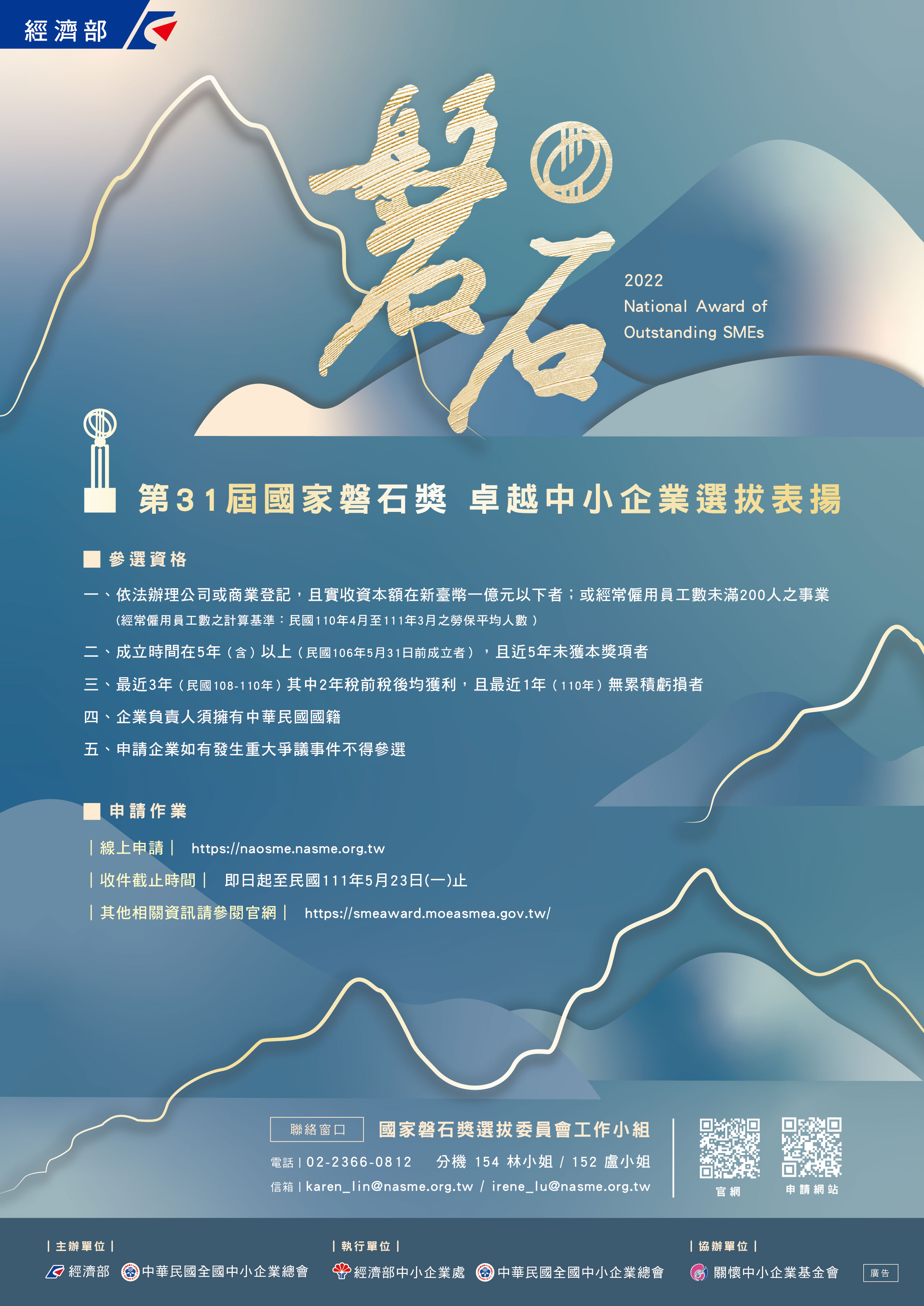 111年度「第31屆國家磐石獎-卓越中小企業選拔表揚活動計畫」自即日起至5月23日(一)止受理報名,請符合申請資格且各項管理制度及表現傑出之中小企業踴躍參加。