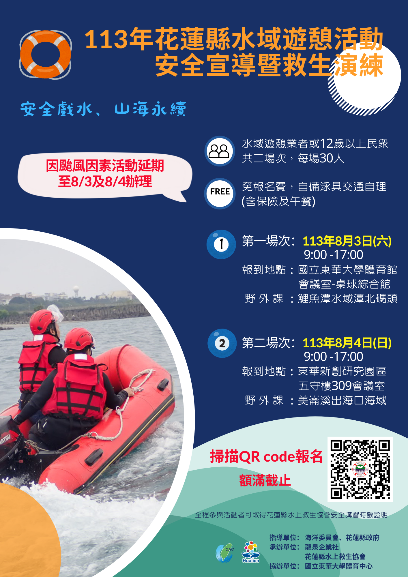 113年花蓮縣水域遊憩活動安全宣導暨救生演練活動,因應凱米颱風來襲,延期至113年8月3日、8月4日辦理