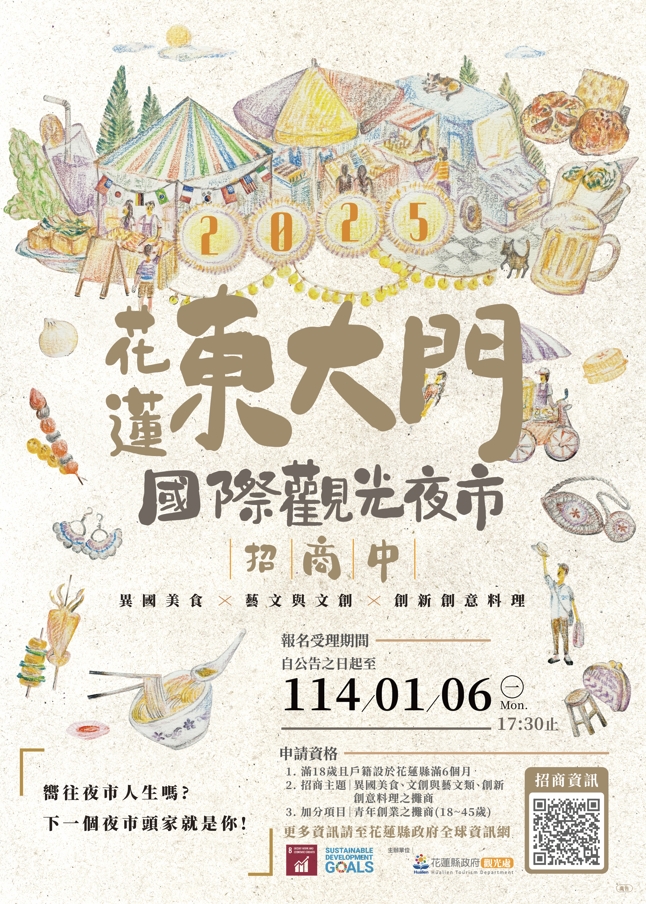 - 更多詳細資訊請參閱:「114年度花蓮東大門國際觀光夜市攤位招商遴選簡章」及相關附件檔。
