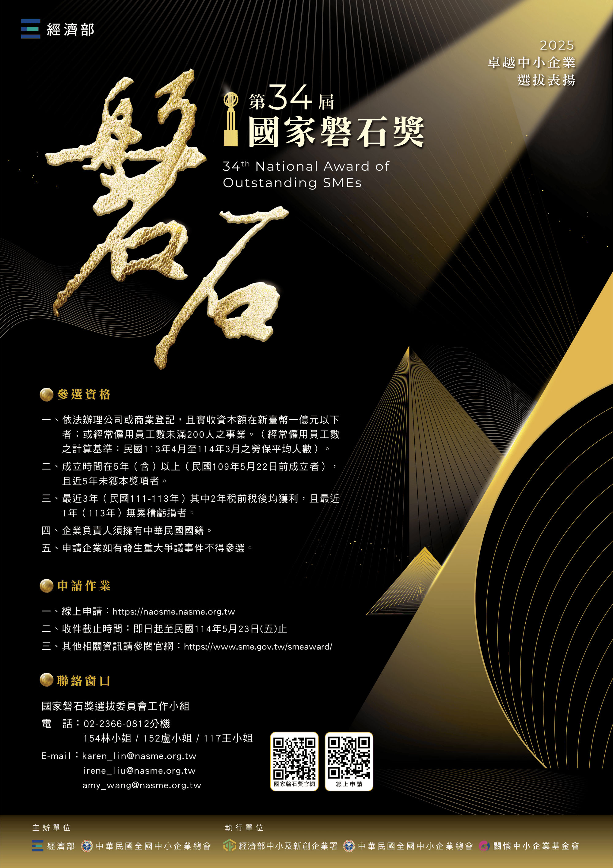 三、本案自即日起至5月23日(五)止受理報名,請踴躍推薦並鼓勵符合申請資格且各項管理制度及表現傑出之中小企業參加。