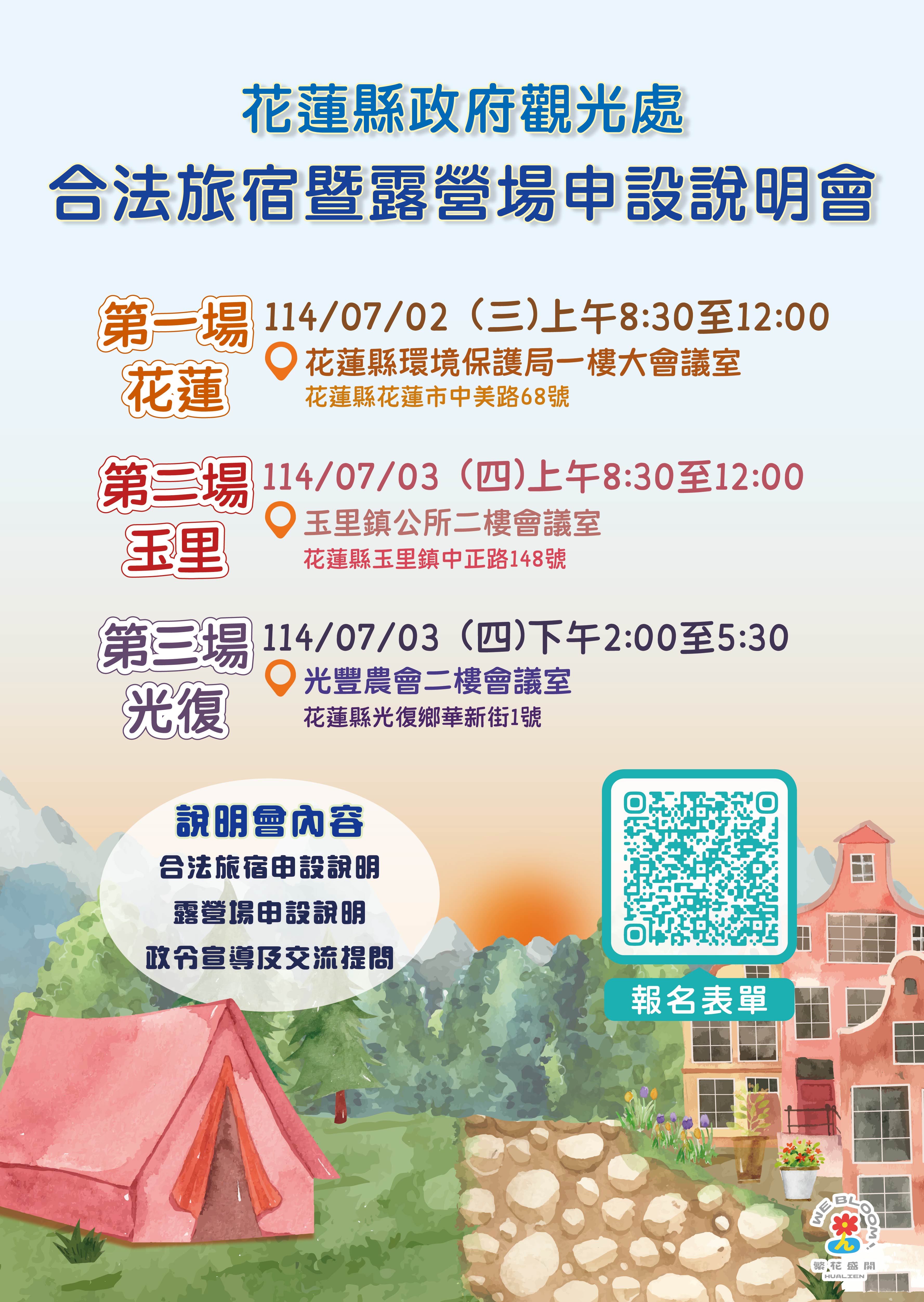 主旨:本府於114年7月2日、7月3日假花蓮市、玉里鎮、光復鄉辦理「合法旅宿暨露營場申設說明會」,敬請惠予公告周知,請查照。