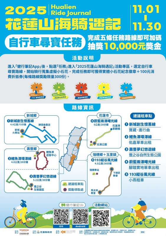 「2025花蓮山海騎遇記」系列活動自11月1日啟動後,已吸引全國各地近千名自行車愛好者踴躍參與,體驗結合低碳旅遊與數位尋寶的創新模式。隨著活動進入尾聲,花蓮縣政府誠摯邀請全國民眾,把握倒數階段,以最環保永續的單車方式,深入探索花蓮的山海祕境,用您的雙腳,親自感受這片土地的溫暖與魅力。