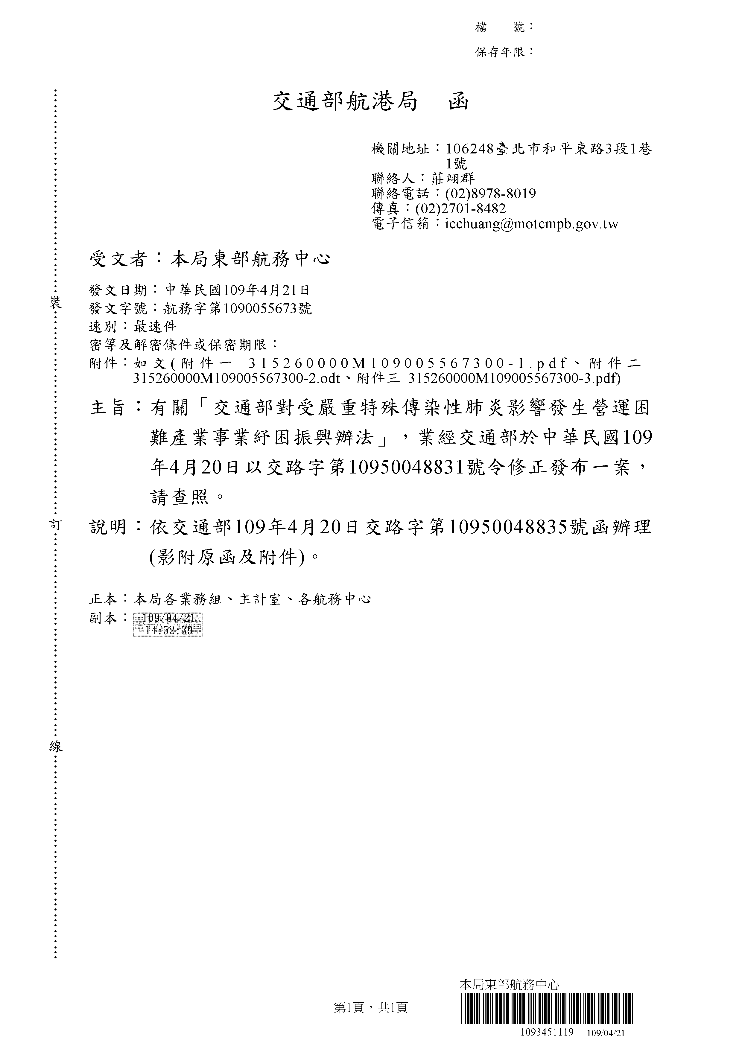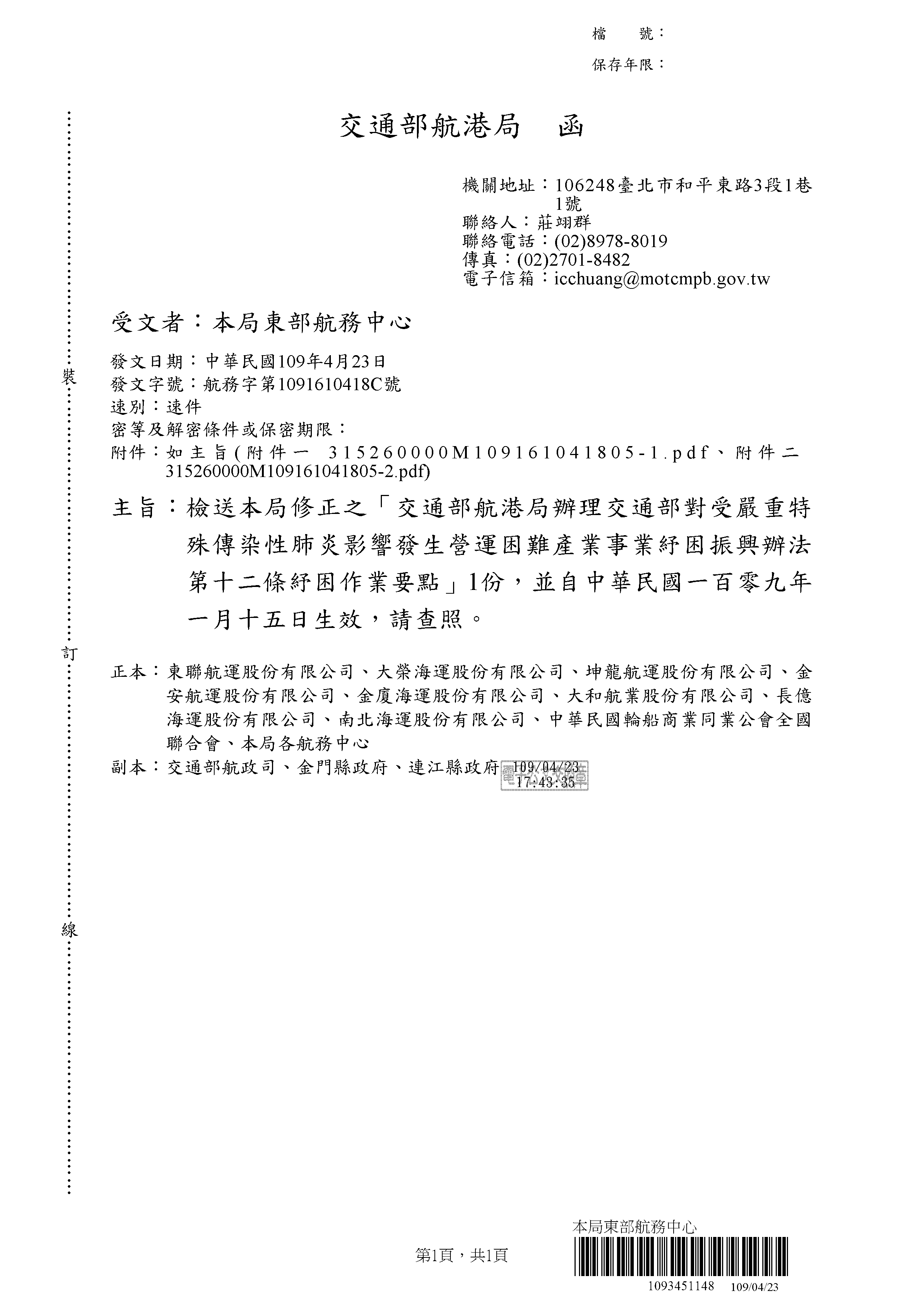 交通部航港局修正之「交通部航港局辦理交通部對受嚴重特殊傳染性肺炎影響發生營運困難產業事業紓困振興辦法第十二條紓困作業要點」